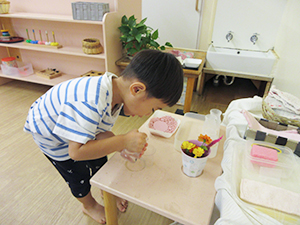 保育事業本部の各園では、イタリアのモンテッソーリ教育を取り入れています。朝、登園すると、自分のやりたい活動を見つけて取り組んでいます。誰かのために環境をきれいにしたり、手で触れ、五感を使って様々なことを環境から吸収しています。秋になり、道具を扱う運動の調整力、好奇心、探求心、集中力が高まってきました。その様子の一部をご紹介します。